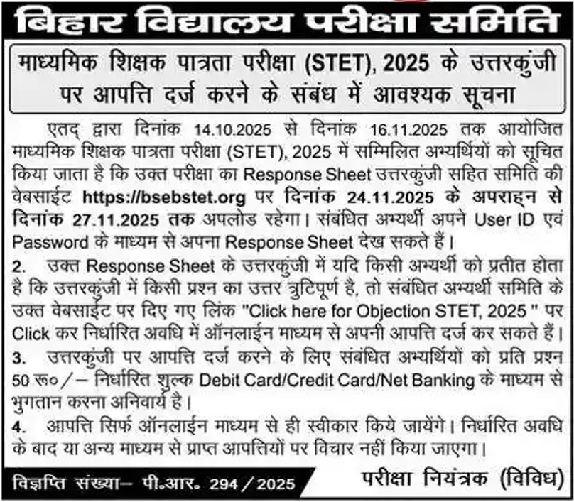Bihar STET Answer Key 2025 Download – आधिकारिक नोटिस