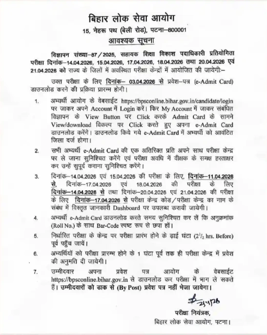 निष्कर्ष :- BPSC AEDO Admit Card 2026