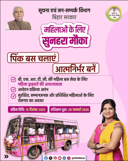 BSRTC Pink Bus Driver Training 2025:- आप सभी को बताना चाहते है कि बिहार सरकार लगातार महिलाओं को आत्मनिर्भर बनाने की दिशा में काम कर रही हैं | इसी कड़ी में बिहार राज्य सड़क परिवहन निगम (BSRTC) ने महिलाओं के लिए एक शानदार योजना शुरू की है | आप सभी उम्मीदवारों को बताना चाहते है कि BSRTC Pink Bus Driver Training 2025 ऑफलाइन आवेदन शुरू हो चुकी हैं, और आवेदन का अंतिम तिथि 15 दिसंबर 2025 तक ऑफलाइन आवेदन कर सकते हैं।